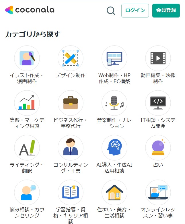 ココナラは、相談・制作・代行など、自分の得意分野をサービスとして出品できるプラットフォームです。単発の依頼から始めやすく、まずは無理のない範囲で試しながら進められる点が魅力です。
