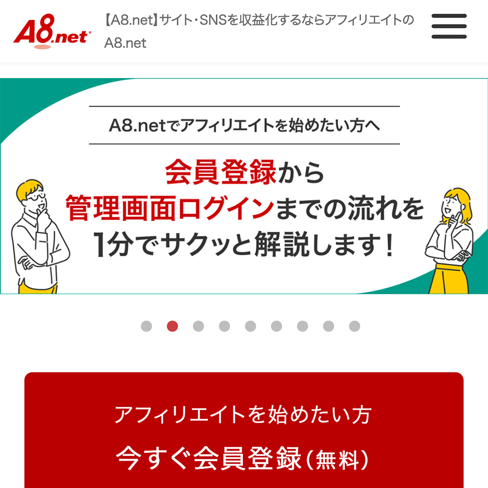 A8.netは、広告主と提携して成果に応じた報酬を目指せるアフィリエイトサービスです。登録無料で始められ、広告の種類も多いため、取り組み方を比較検討しやすい点が特長です。
